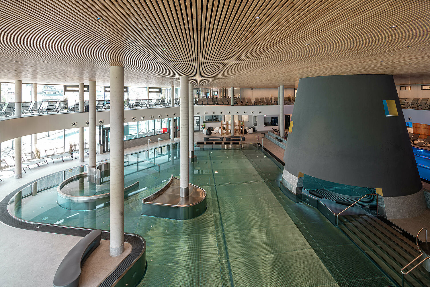 The Silvretta Therme in Ischgl opened in winter 2022 after a three-year construction period. Already during the planning phase, the focus was set on a resource-saving construction method. The building was planned and constructed to be as sustainable and energy-saving as possible. REGUPOL products from the winter sports and acoustics sectors were also used in the construction of the spa.