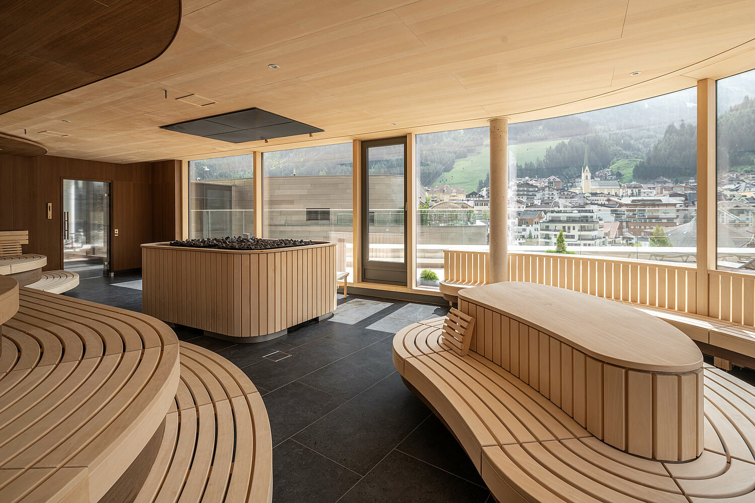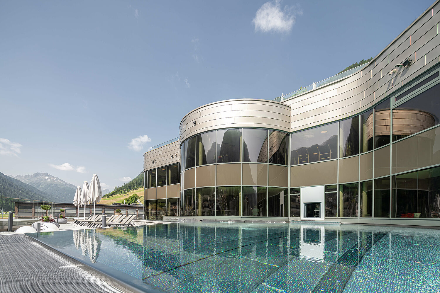 The artistic form of the spa nestles perfectly into the surrounding landscape. The architectural highlight of the building is the champagne-colored exterior façade, which emphasizes the elegant appearance and whose interaction with the surroundings changes throughout the seasons. Inside the spa, the focus is on the element of water in its three states of aggregation - ice, water and steam. In two buildings, a multifaceted offer for locals and guests extends over four floors.