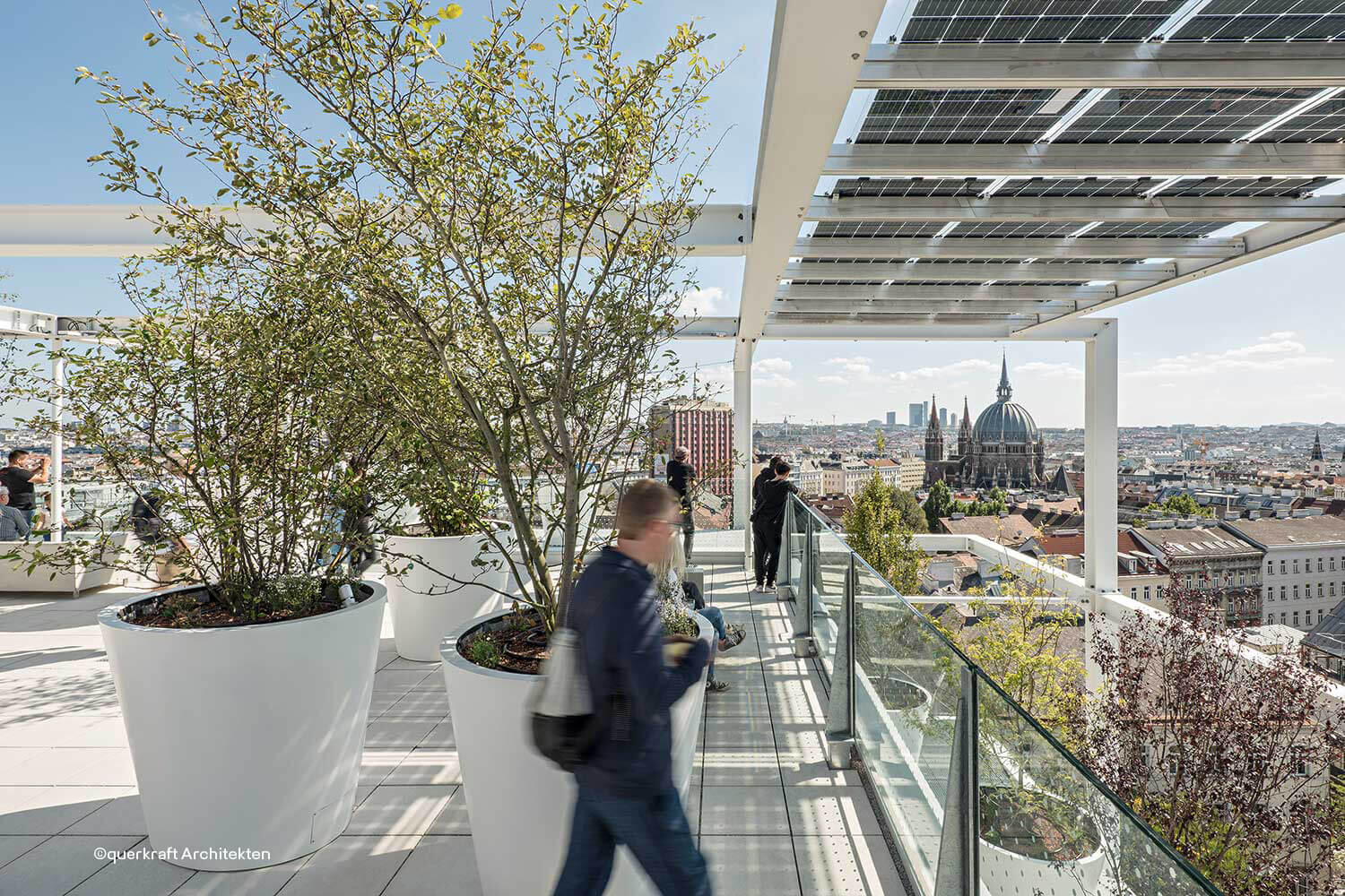 The architecture and the possibilities for use are always decisive factors for the success of a building, and Querkraft Architekten have done a great job here. They have created a distinctly communicative structure with urban experience spaces and active roof surfaces. A green shell envelopes the entire building. It is 4.5 metres deep, provides abundant shade and houses rooms, terraces, plants and elevators, emergency stairs, toilets and the building services.