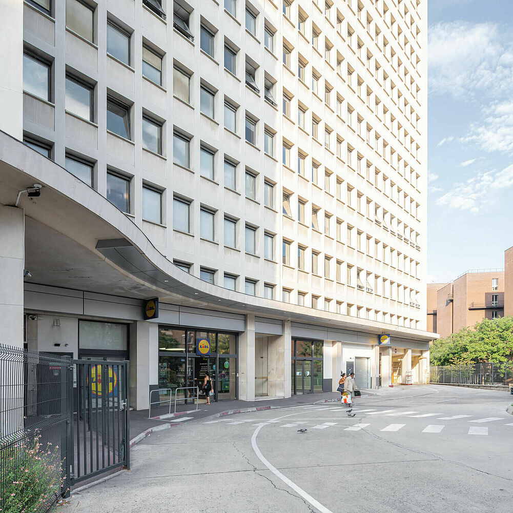 In today’s vibrant cities a good local supply is essential. Supermarkets have learned to unlock this potential by acquiring buildings in the city centers and using the ground floor for their stores. However, the quietness of living spaces above is at risk due to the noise and vibrations coming from rolling shopping trolleys and warehouse deliveries for the markets. In the 13th arrondissement of Paris, a LIDL supermarket has been integrated into a multi-residential building.